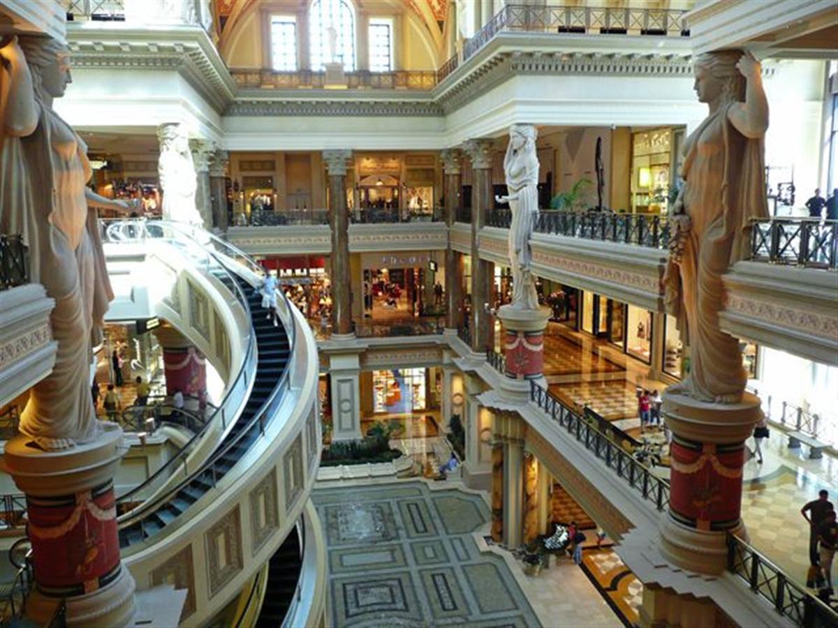 Roman flair in the Ceasars Palace. The decoration inside the Mall Forum Shops at Ceasars is very pompous. The escalators is curved