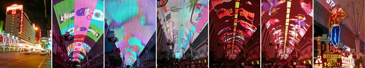 A pedestrian zone is covered with an about 1000 ft long video roof. There are short video shows from time to time and then all casinos and restaurants switch off their outside lights