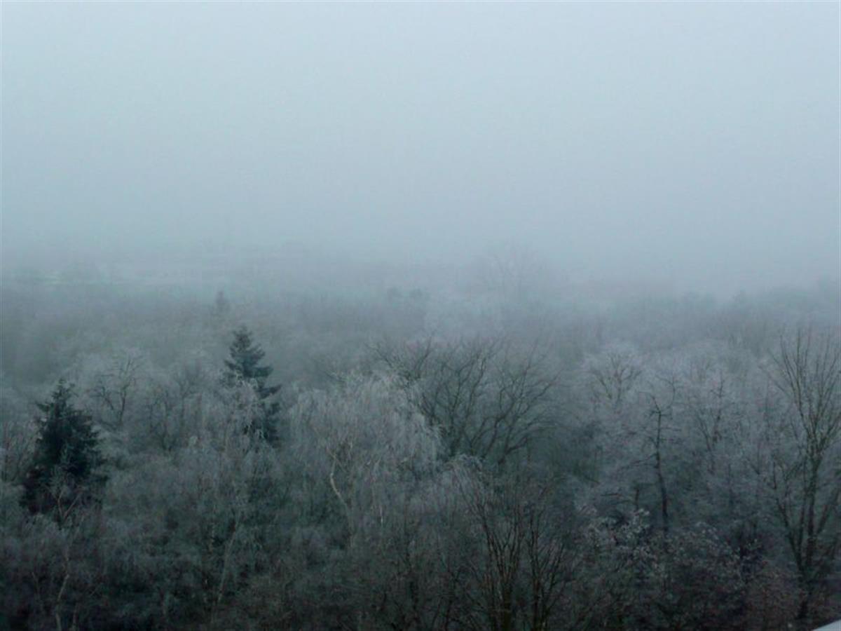 View from my appartment. It is cold and foggy and the trees in the graveyard behind my house are covered with hoar frost