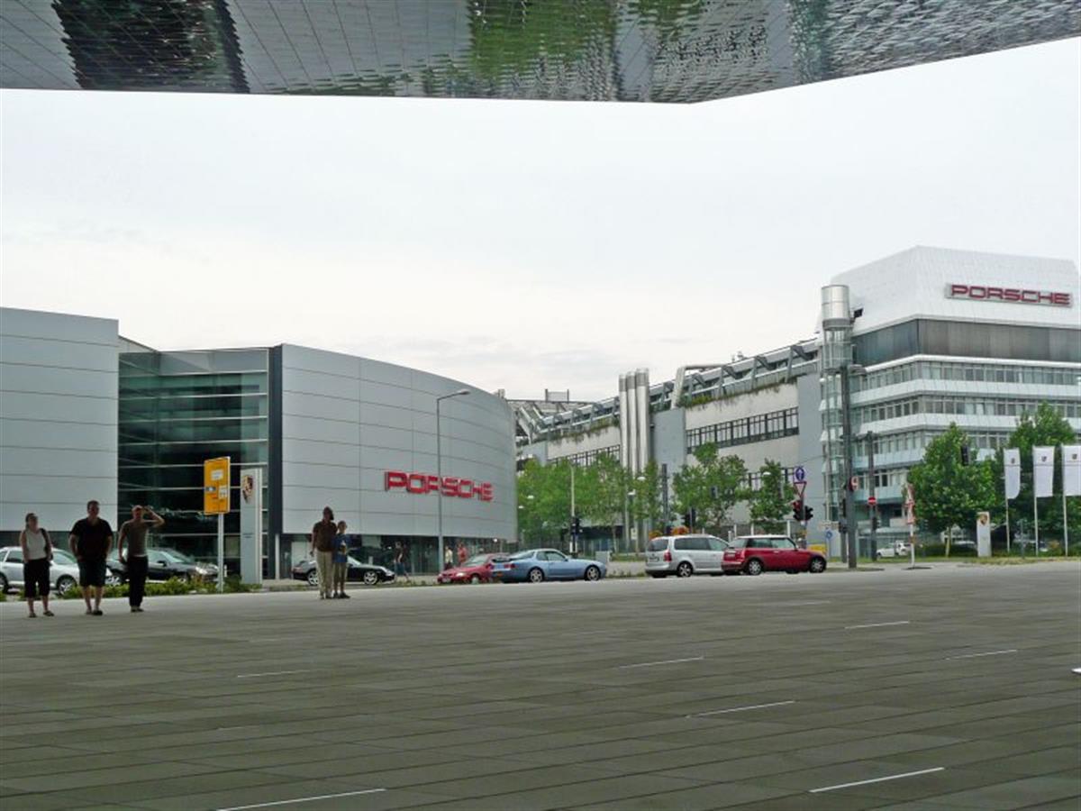 Porsche everywhere. The left hand side building is the Stuttgart Porsche dealership, the right hand side is part of the Porsche plant.