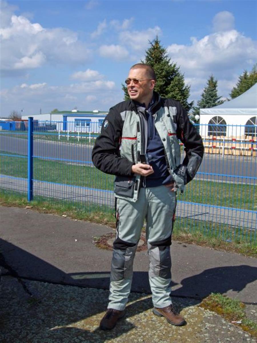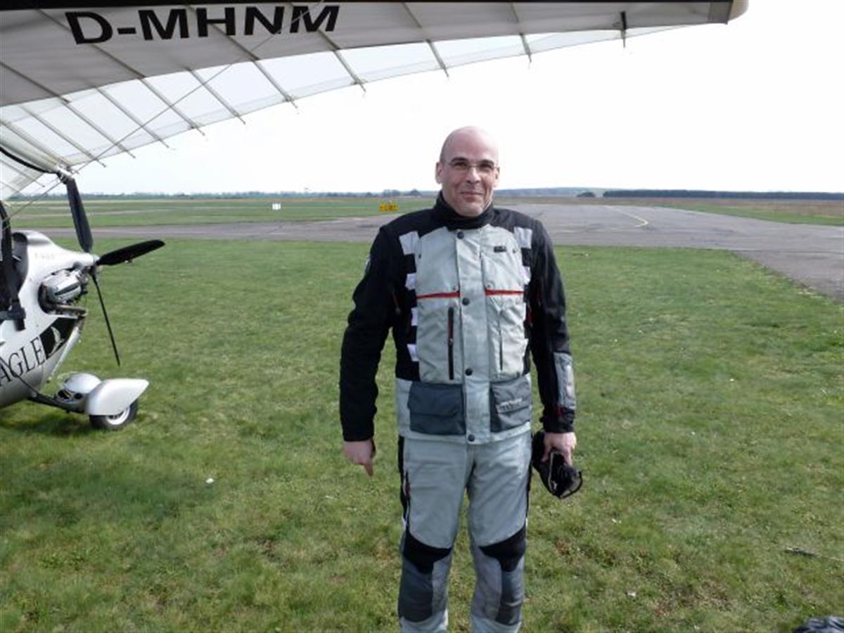 Tom gets ready. We take our motorbike gear. It is quite chilly and you are completely exposed to the wind. There is a seat heating available but it remains rather cold up in the air.