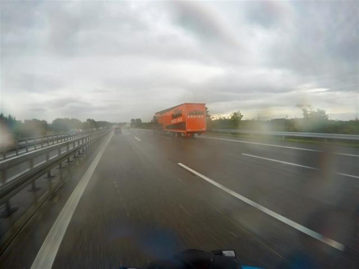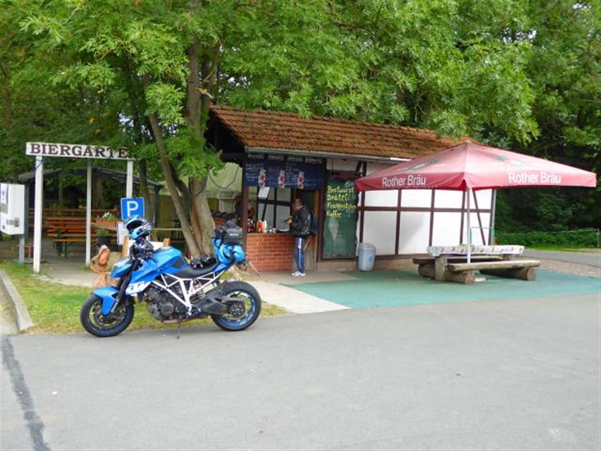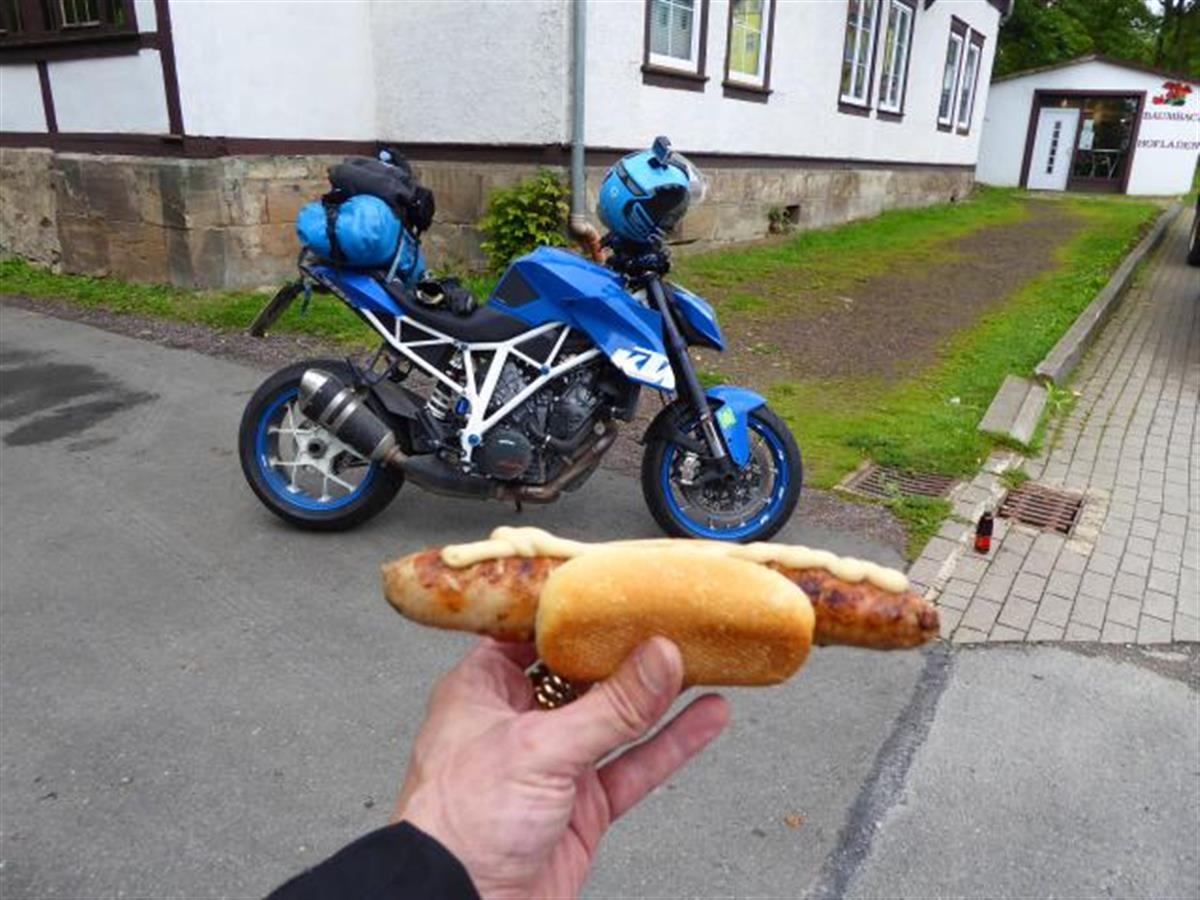 I return home in one go. There are rain systems over Germany. I go 715 miles mainly on the Autobahn. But getting a Thuringian Bratwurst in Stadtilm is a must.