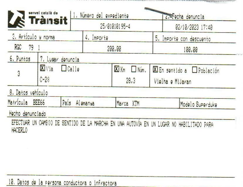 200 Euros for Changing direction on a highway in a place not authorized to do so.