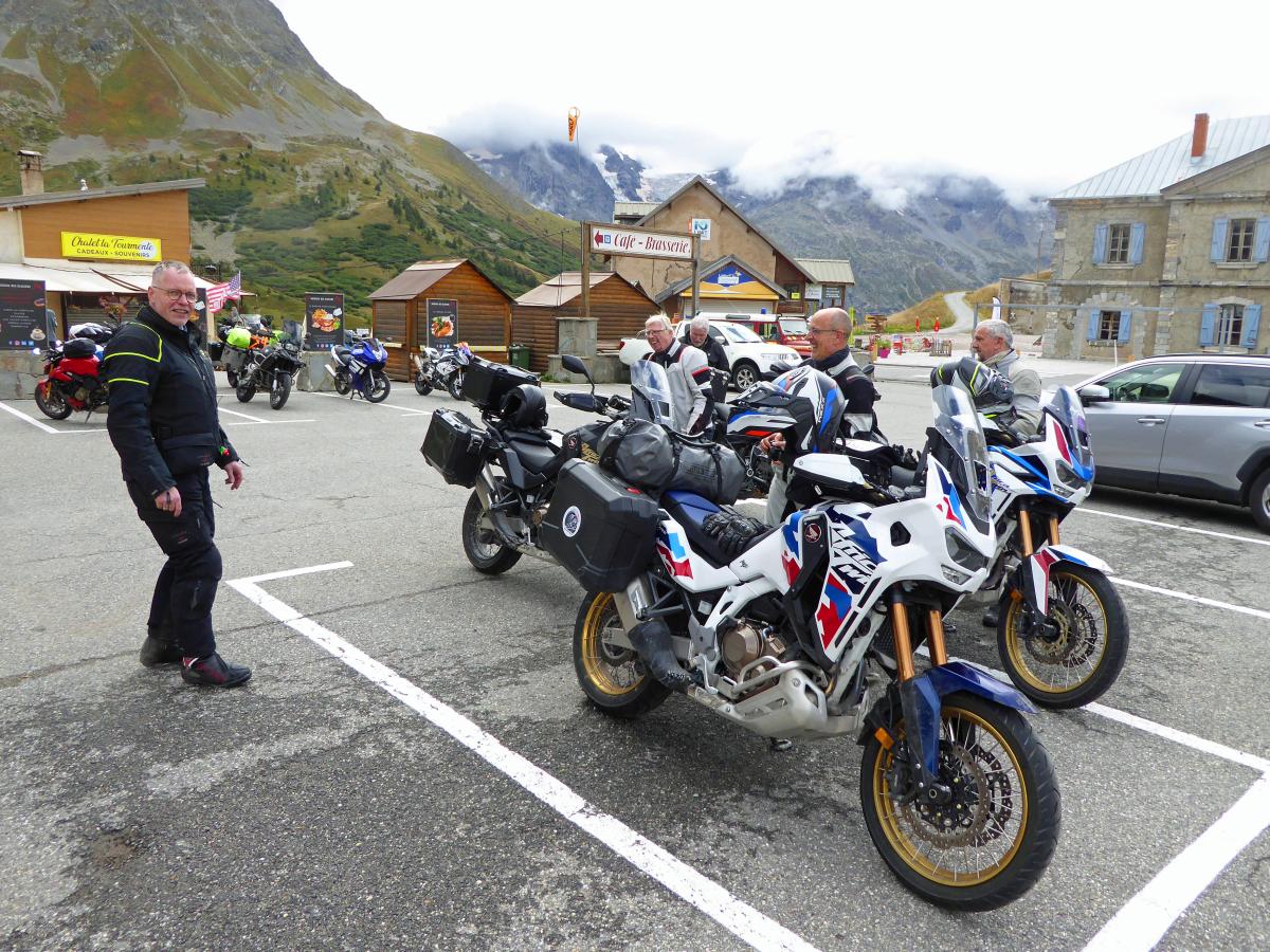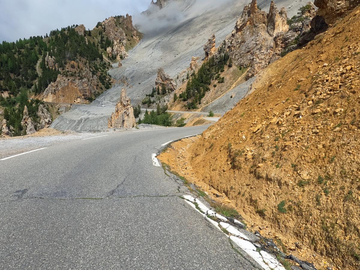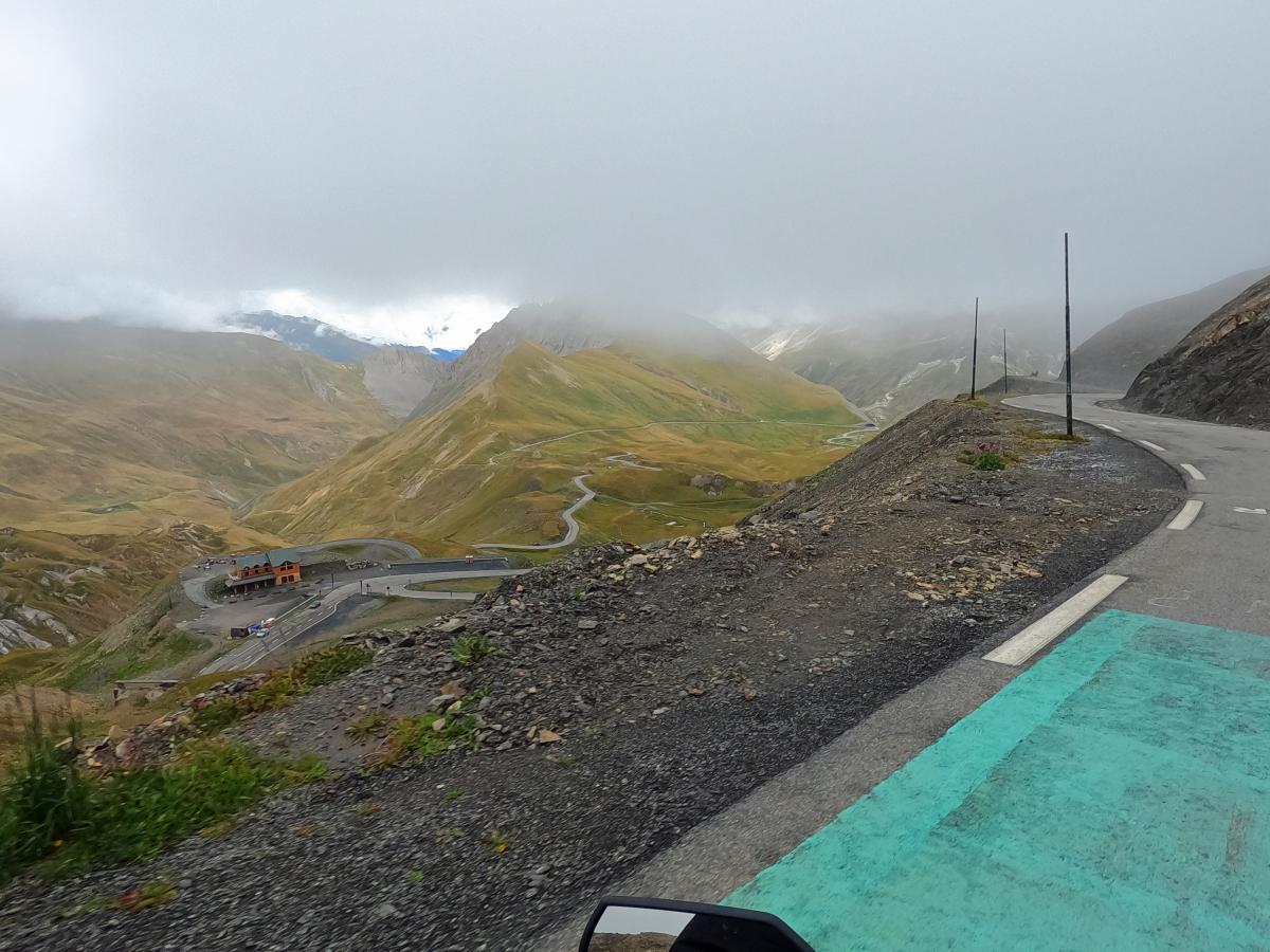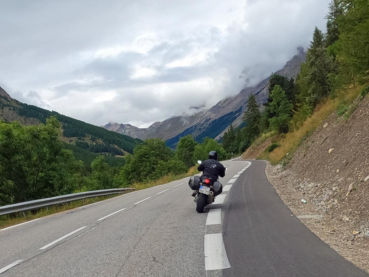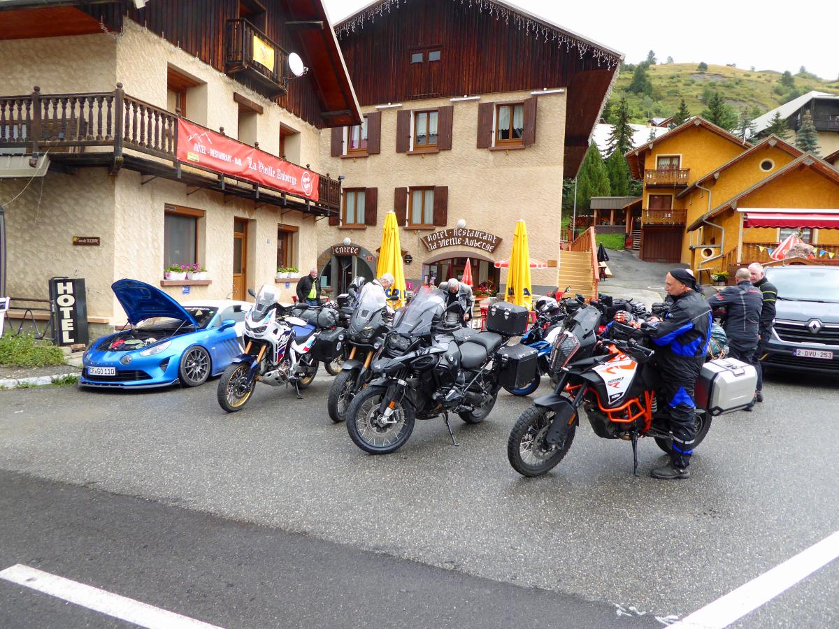 There were heavy thunderstorms with heavy rain during the night. The rain eased a little in the morning, but the roads were still wet. A mudslide on the Col des Champs blocked our way. So we had to head back south and then over the Col de Colle-de-Saint-Michel and through the Gorges de Daluis towards Valberg and then over the Col de la Cayolle. Everything was wet and then rain, fog, cold and wet roads on the Cayolle. Things could be better. Fortunately, another mudslide before the Col de Var had already been half cleared and we were able to pass. After lunch it dried up and so we were able to ride the Col d'Izoard and Col du Galibier on dry roads. All in all very exhausting.